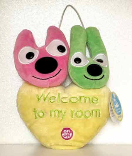 a plush door hanger that says "welcome to my room". this hangs in my room on the wall beside the door, it's so cuteee